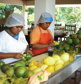 El zapote negro (árbol de la familia Ebenaceae, especie Diospyros digyna), la ciruela mexicana (árbol de la familia Anacardiaceae, especie Spondias purpurea) la guayaba (arbusto tropical de la familia Myrtaceae, género Psidium), el mango (árbol tropical de la familia Anacardiaceae, género Mangifera), la zarzamora (planta rastrera de la familia Rosaceae, género Rubus) y el mamey (árbol de la familia Sapotaceae, especie Pouteria sapota) son productos orgánicos regados con agua de manantial. Las frutas producidas por esta organización provienen de la región de Jungapeo, Michoacán. |
